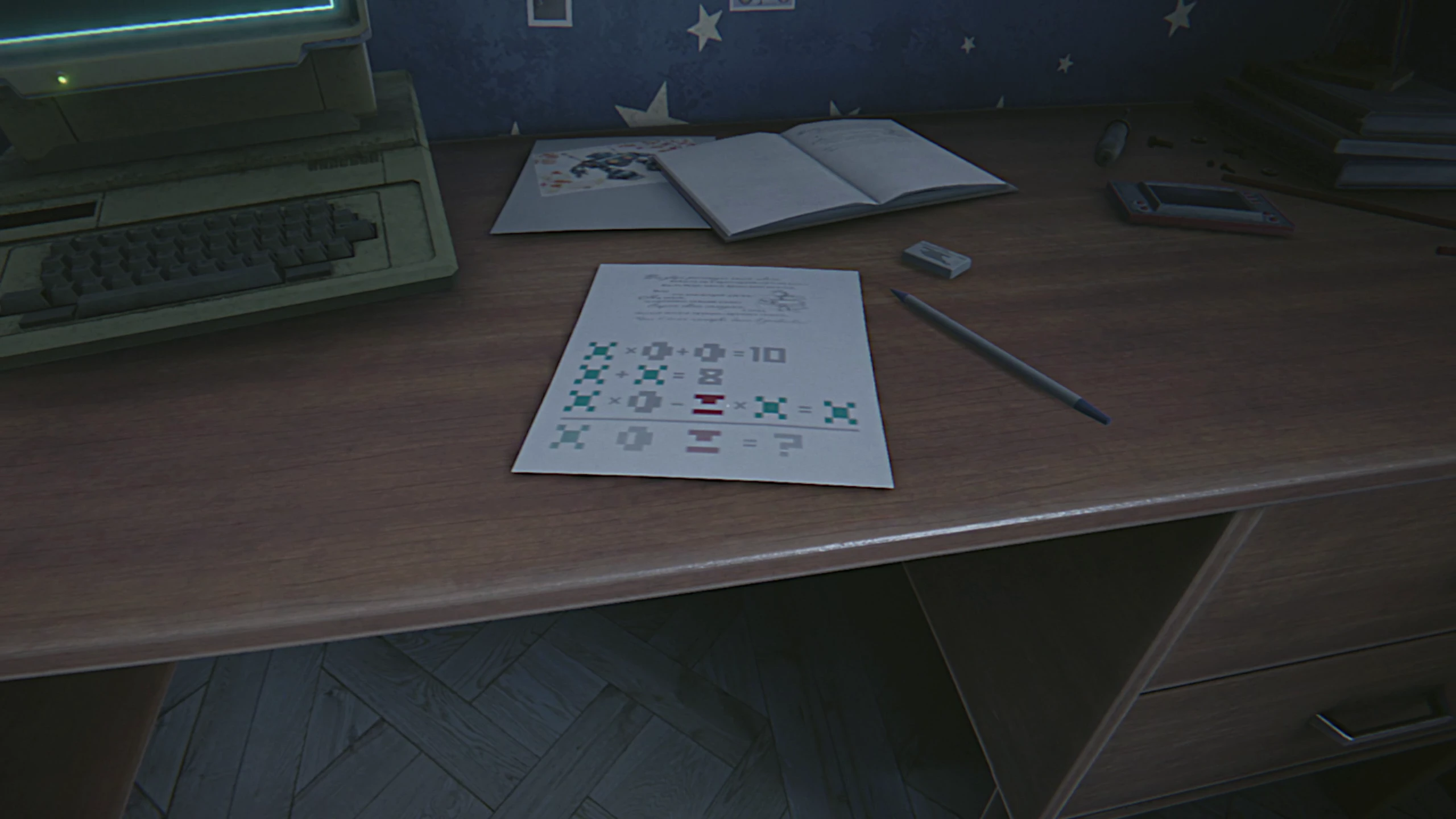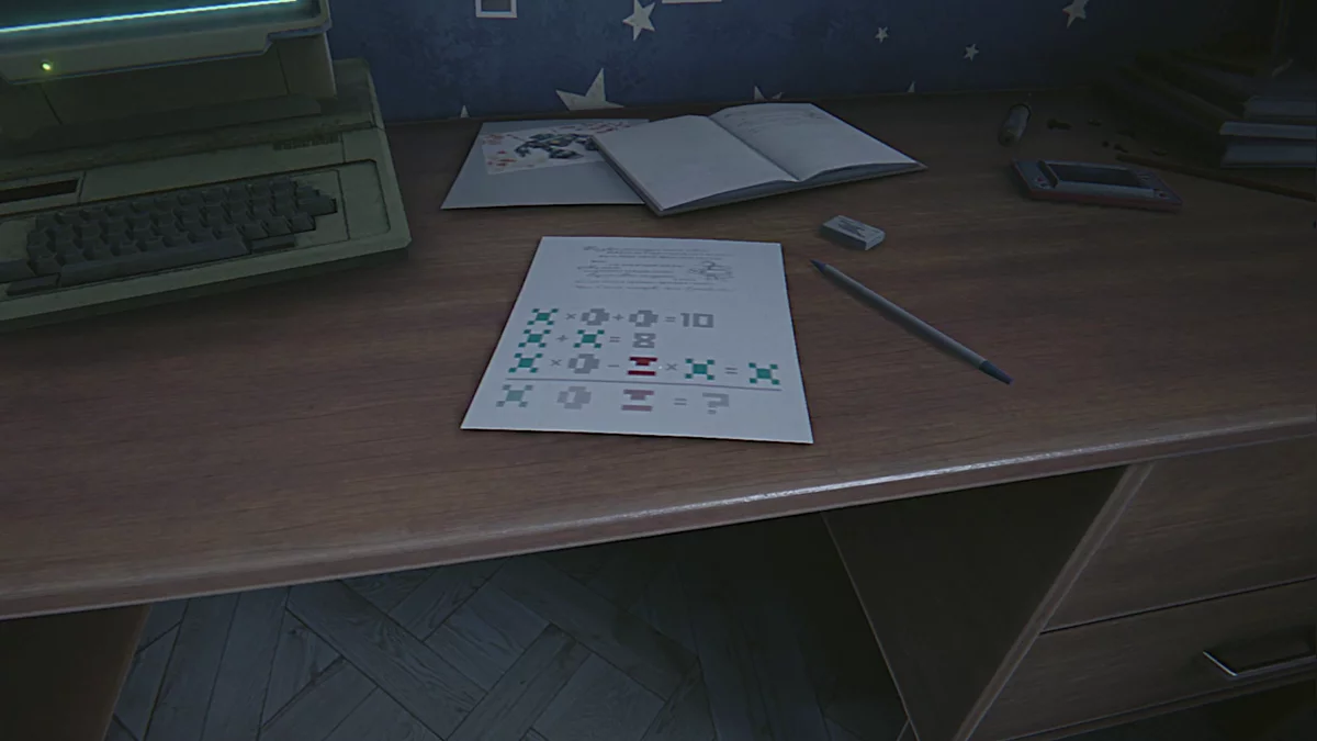 Once in a dream, you need to open the front door, and for this you have to solve a school task that lies on Ignat’s desk. Pay attention to the signs and the number of characters, which will help solve the equations. The answer “4-2-1” can be used to open the front door. This code will also be suitable later, when you reach Ignat’s house in real time.