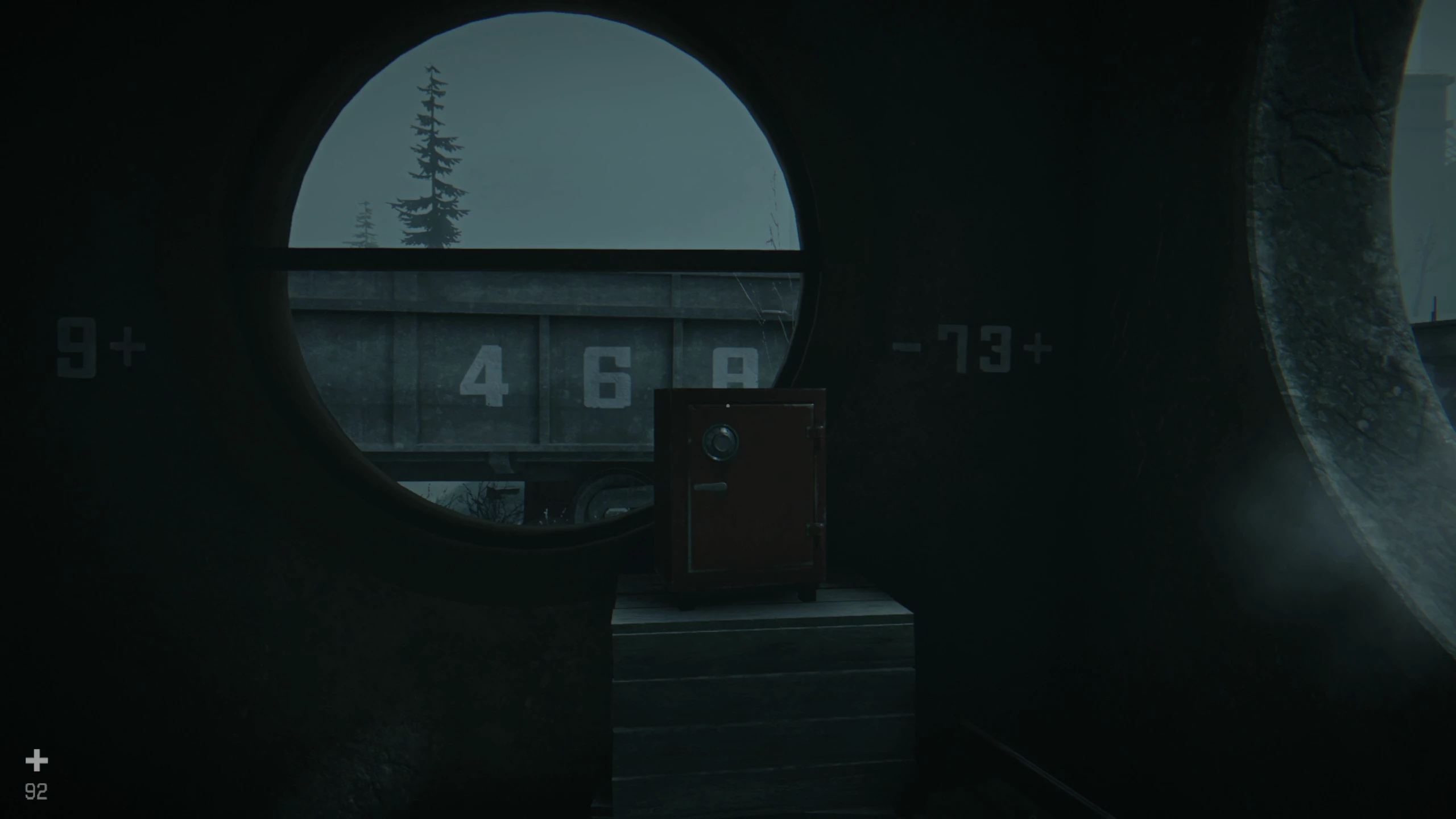 While driving, you will soon notice wagons with numbers and two huts on the left. Stop and explore them. To open the safe, you need to make the right equation and get a four-digit number. All numbers with signs that can be found: 9+468-73+607-93+734, which is equal to 1652. Open the safe using this number. As a reward, you will receive shotgun cartridges (7) and food.