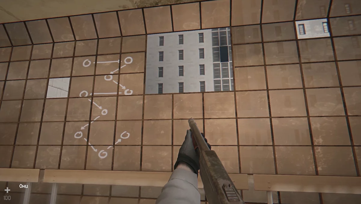 Having picked up the weapon, leave the toilet and turn right. Interact with the keypad to make your partner start hacking the mechanism. It takes about 2 minutes to hack, then return to the toilets. The windows will show the code “5-7-6”, which will open the passage to the sewers.