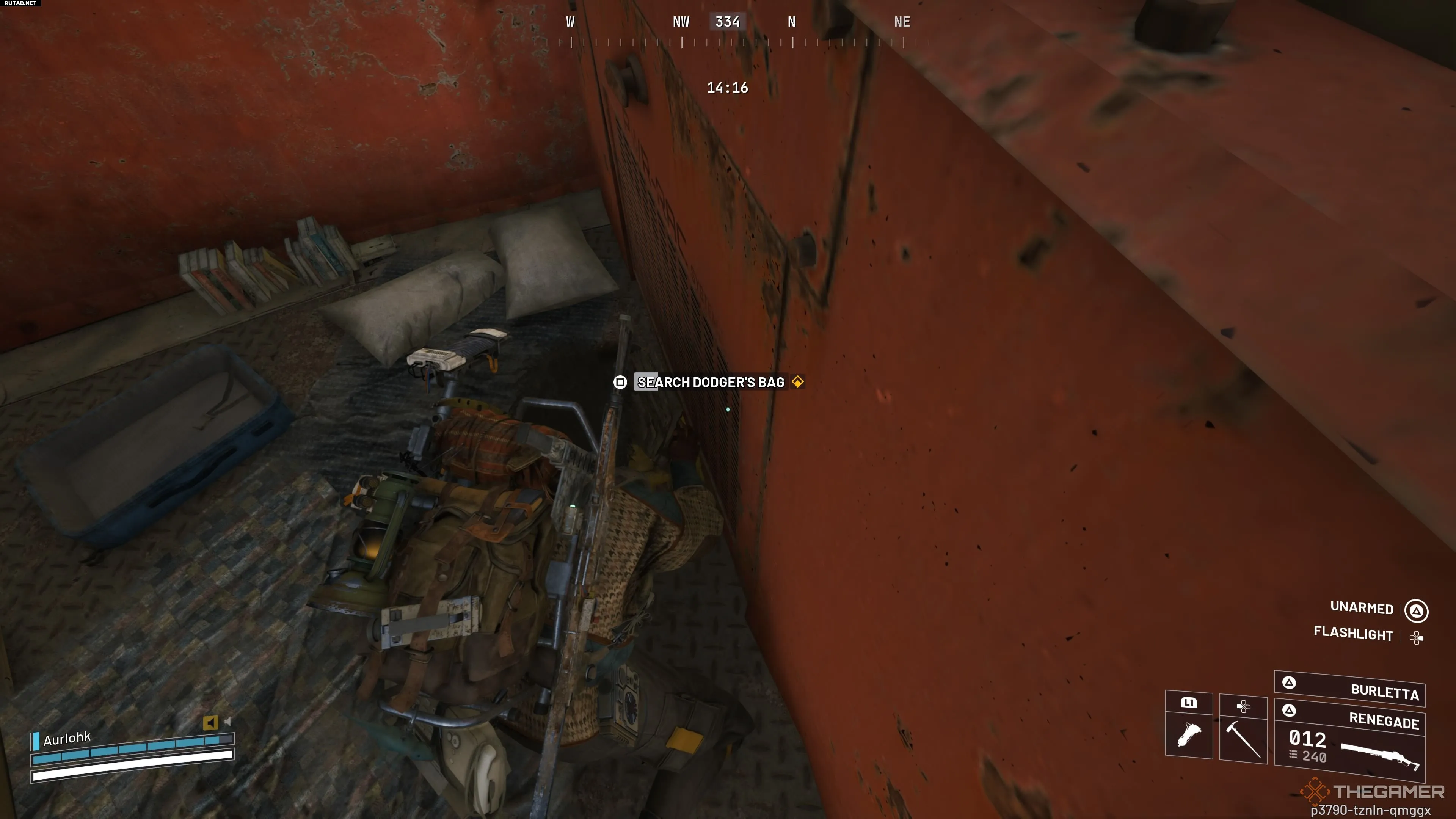 Between the tall red consoles on the right side of the platform you’ll find a small living area with a yellow duffel. Search it to pick up the quest item “Dodger’s Note” required for the final objective.